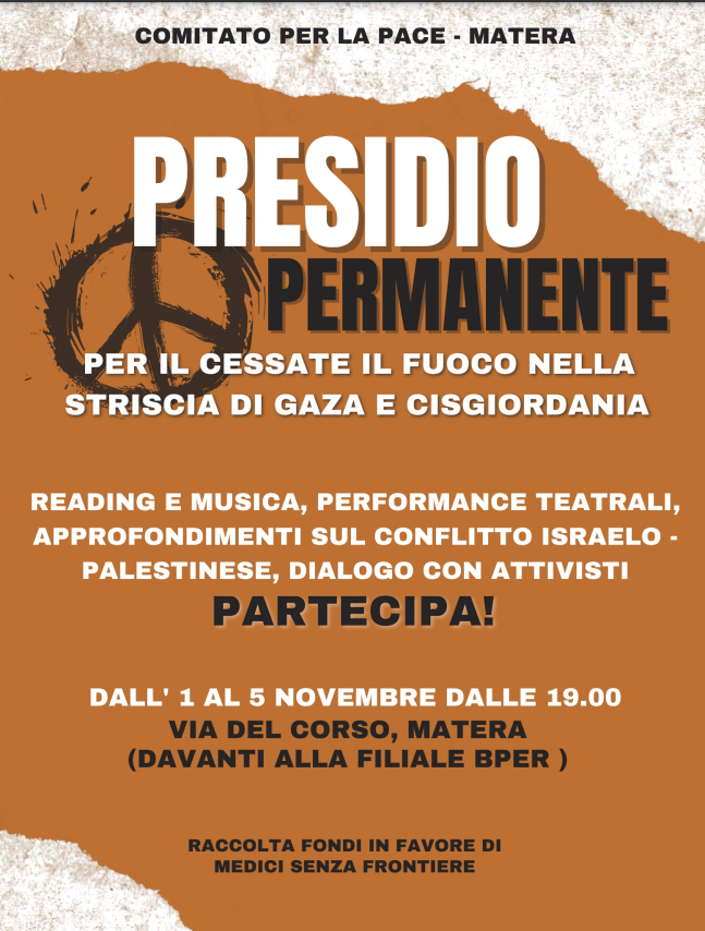 Dopo il flash mob di domenica 29 ottobre a cui hanno partecipato circa duecento cittadini, si terrà a Matera il presidio permanente per chiedere il “cessate il fuoco” immediato nella striscia di Gaza.